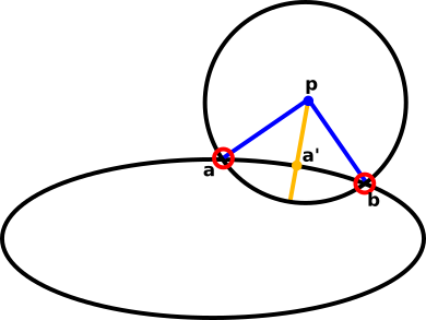 Consider the previous algorithm when the ellipse is a circle, a’ then trivially lies on the line between c and p. It can also be seen that a’ is optimal. The idea is to approximate the ellipse as a circle, but first we must consider curvature.