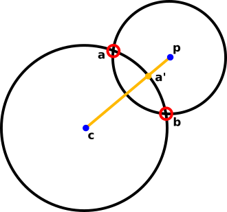 An oversized circle will intersect the ellipse at least two times. The iteration to minimise the distance between point a on the ellipse and p is as follows:
