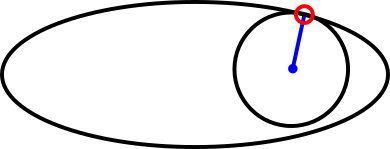 Every point on the ellipse has a perpendicular normal. Also every point has a radius of curvature. A tighter curve will result in a smaller radius of curvature, while a slight curve will yield a larger radius of curvature. The centre of curvature of some point e on the ellipse is the centre of the circle with radius equal to the radius of curvature and perpendicular to the ellipse at e ( 3 of these poonts are shown below). In other words, it is the centre of the circle that locally approximates the ellipse at e. The centre of curvatures of all points can be plotted to form the evolute of the ellipse, shown as the blue line below.